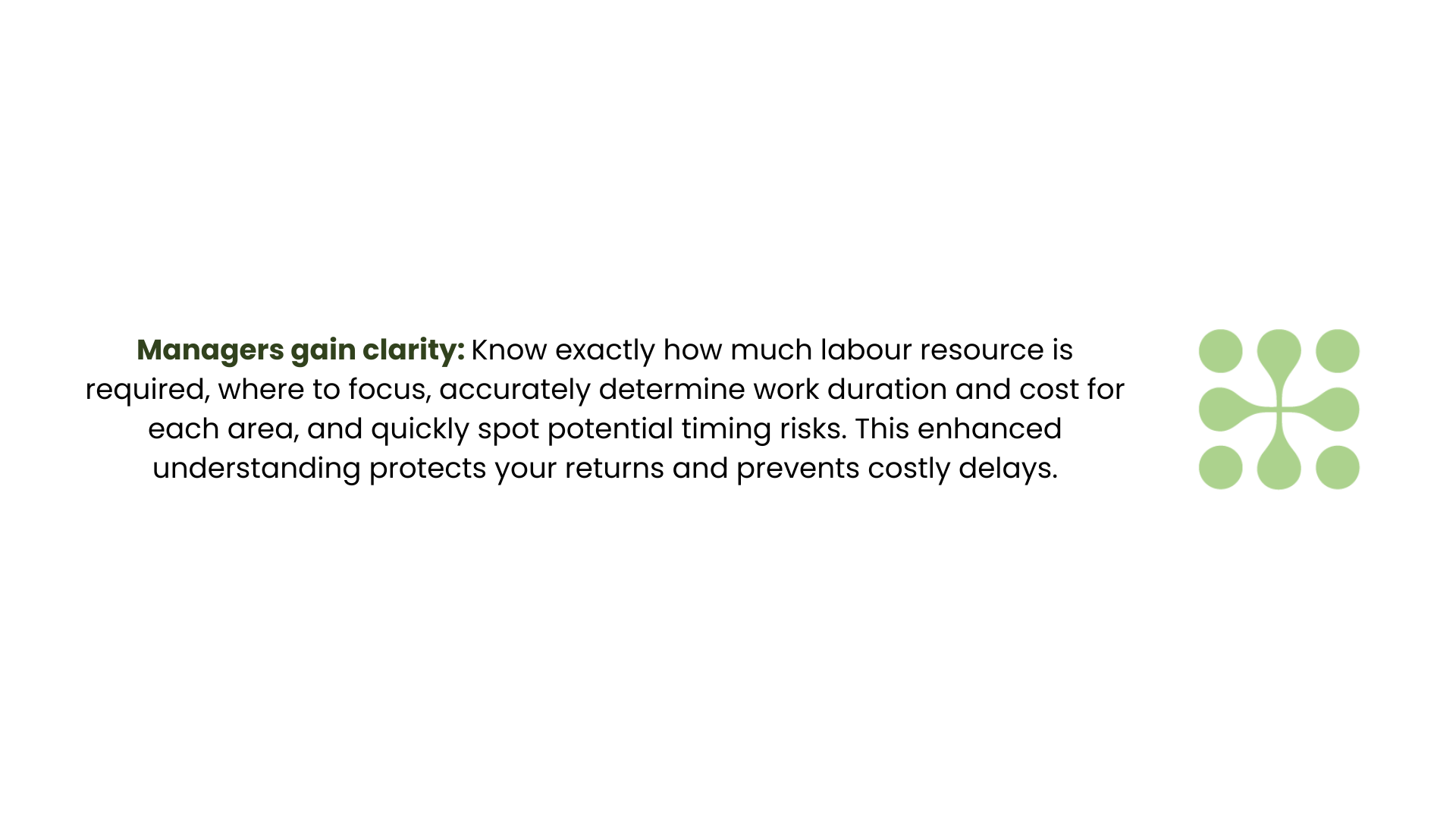 The output delivers an actionable plan, detailing exact rows, precise metre locations, optimal prioritisation for thinning zones, and estimated hours and cost for work completion.